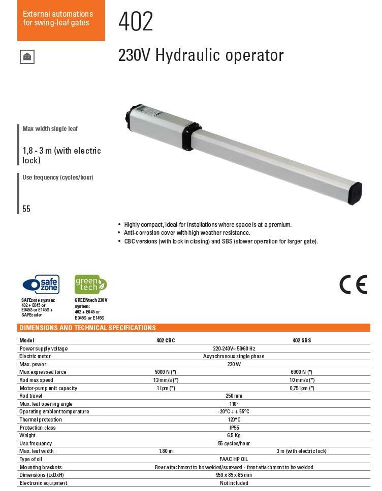 - سیستم هیدرولیک پیشرفته : هیدرولیک بودن جک لولایی (بازویی) FAAC 402 SBS موجب عملکرد روان و بدون لرزش درب می شود و فشار ناگهانی بر موتور و لولاها را کاهش می دهد. برخلاف جک های الکترومکانیک، هیدرولیک طول عمر بالاتر، مصرف انرژی کمتر و سرویس کمتر دارد و در طولانی مدت هزینه های نگهداری را کاهش می دهد.